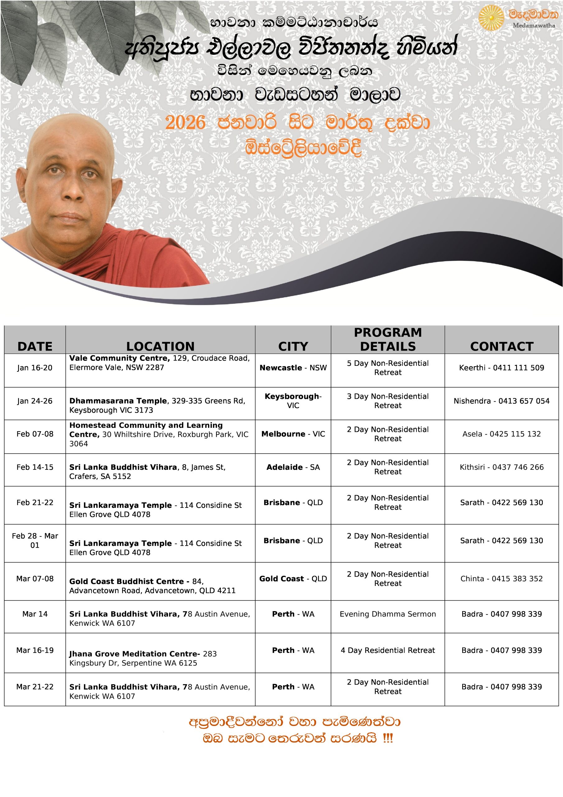 මෙහෙයවීම : තුෂාරිකා මහත්මිය - 077 7304415.